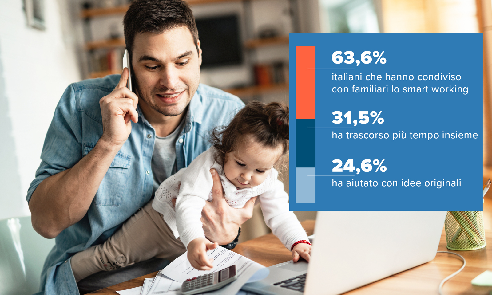 Lo abbiamo chiesto ai nostri utenti e il primo dato significativo ci racconta che nell’ultimo anno il 63,6% degli Italiani ha condiviso con familiari e/o conviventi momenti di smart working, o direttamente o perché lo ha fatto chi vive sotto lo stesso tetto.